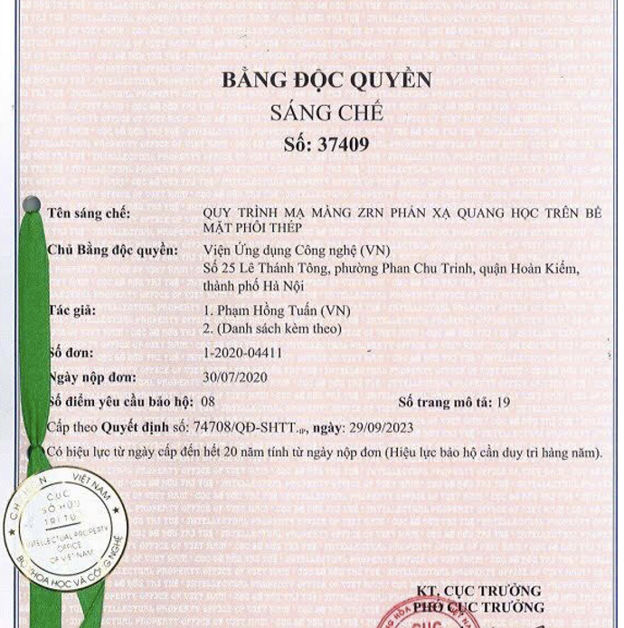 Theo quyết định số 74708/QĐ-SHTT ngày 29/9/2023 của Cục Sở hữu trí tuệ cấp cho sáng chế: “ Quy trình mạ màng ZrN phản xạ quang học trên bề mặt