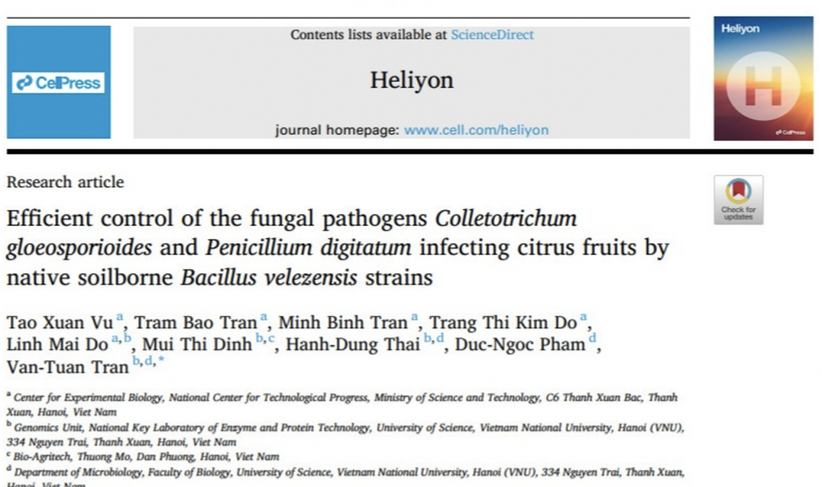 Trung tâm Sinh học thực nghiệm công bố Quốc tế kết quả nghiên cứu mới về kiểm soát vi nấm gây bệnh ở cây có múi trên tạp chí Heliyon (Q1/IF 3.77)