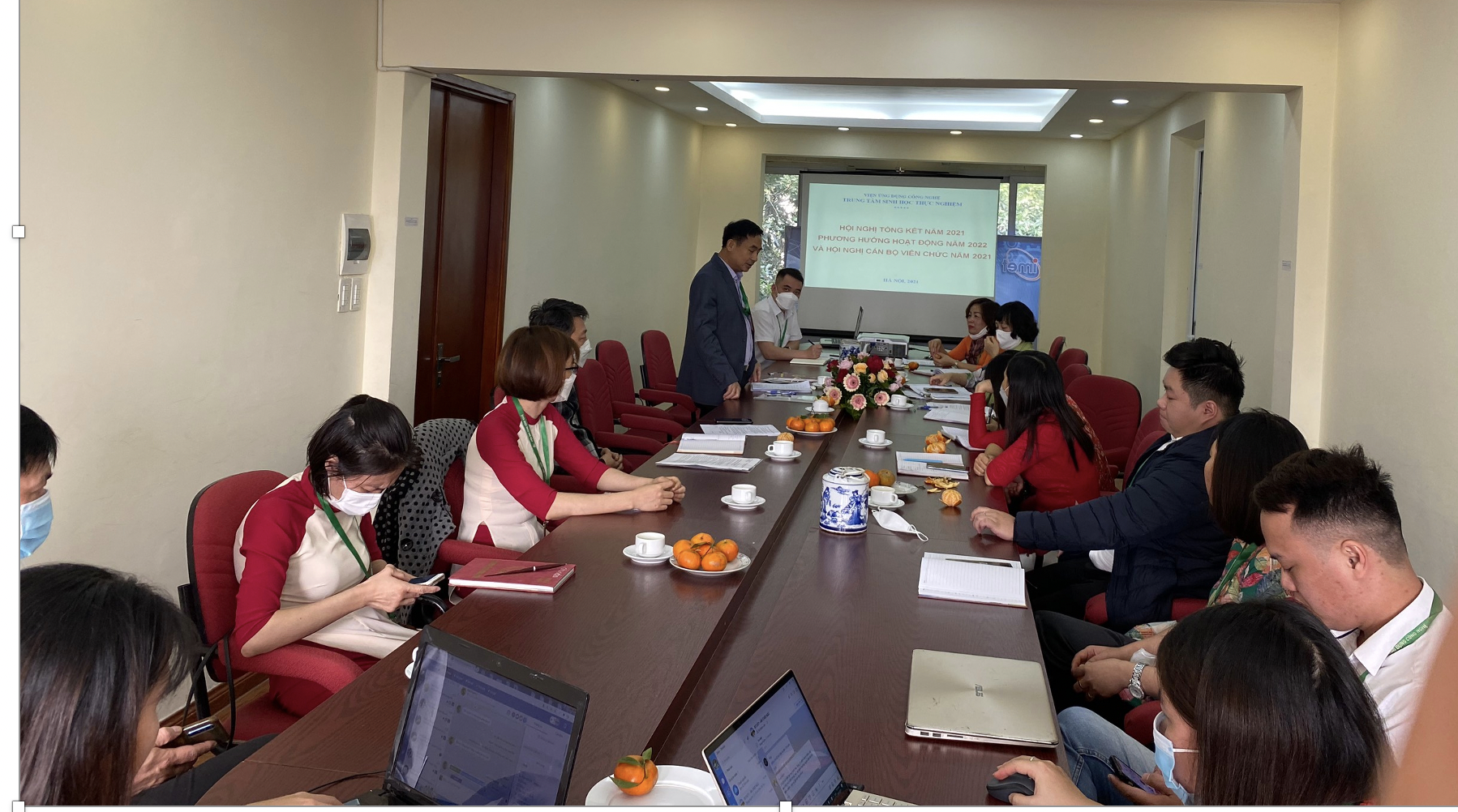 Thực hiện kế hoạch công tác của Viện Ứng dụng Công nghệ, ngày 14/12/2021, Trung tâm Sinh học Thực nghiệm đã tổ chức Hội nghị tổng kết công tác năm 2021, phương hướng nhiệm vụ năm 2022 và Hội nghị cán bộ viên chức năm 2021. Đến dự Hội nghị có Ông Lê Minh Tùng – Đại diện Văn phòng Viện, Ông Nguyễn Minh Nam – Đại diện Ban kế hoạch Tài chính cùng toàn thể cán bộ, viên chức của Trung tâm Sinh học Thực nghiệm.