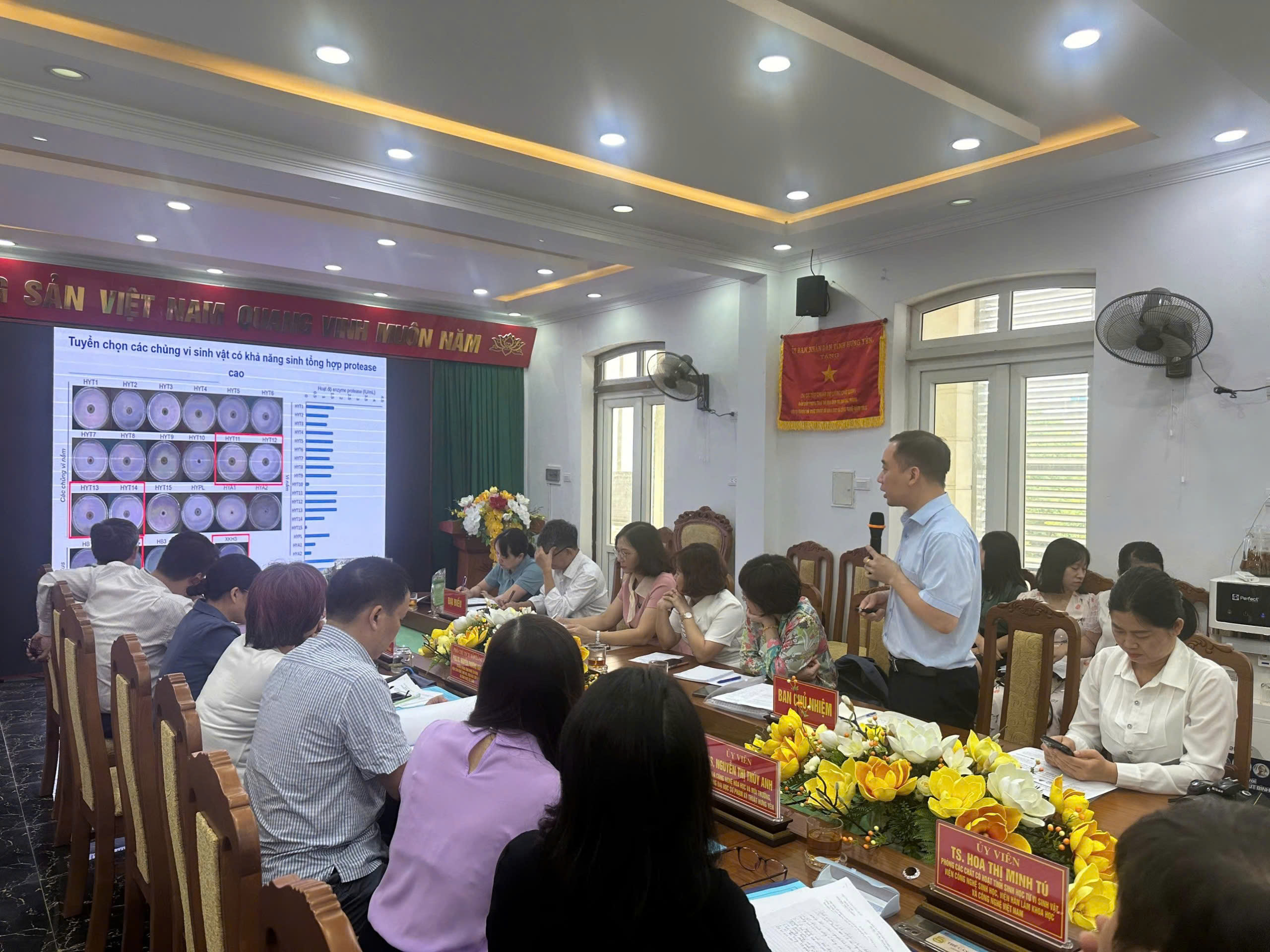 TS. Vũ Xuân Tạo – Chủ nhiệm nhiệm vụ đã báo cáo các kết quả mà đề tài đã đạt được gồm: (1) Xác định được thành phần chính của phế phụ phẩm của quá trình sản xuất nghệ tại Hưng Yên; (2) Tuyển chọn được 4 chủng vi nấm T. asperellum HYT11, HYT12, HYT13, T. harzianum HYT14, 2 chủng vi khuẩn B. amyloliquefaciens BH2 và HB5 và 2 chủng xạ khuẩn S. albulus XKH3 và S. costaricanus XKH5 có khả năng sinh enzyme ngoại bào cao (cellulase, amylase và protease); (3) Tối ưu điều kiện sản xuất sinh khối vi sinh vật tạo chế phẩm vi sinh xử lý phế phụ phẩm từ quá trình chế biến nghệ; (4) Xây dựng được quy trình công nghệ sản xuất chế phẩm vi sinh dạng lỏng và dạng bột dùng cho xử lý phế phụ phẩm từ quá trình chế biến nghệ; (5) Xây dựng được quy trình công nghệ sản xuất phân bón hữu cơ vi sinh từ phế phụ phẩm của quá trình chế biến nghệ, chất lượng phân bón đạt theo QCVN 01-189:2019/BNNPTNT về chất lượng phân hữu cơ vi sinh. Từ các kết quả nghiên cứu trên, nhóm nghiên cứu đã xây dựng được mô hình xử lý phế phụ phẩm của quá trình chế biến nghệ làm phân hữu cơ vi sinh, quy mô 20 tấn nguyên liệu tại Công ty TNHH Hoàng Minh Châu Hưng Yên và Hợp tác xã nghệ Chí Tân.